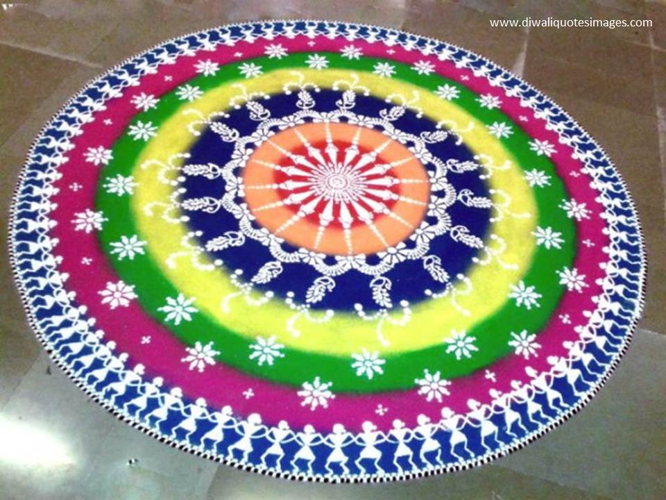 Rangoli, also known as Kolam, is an artform from India in which patterns are created on the floor in living rooms or courtyards using materials such as colored rice, dry flour, colored sand or flower petals. It is usually made during Diwali , Onam, Pongal and other Indian festivals. They are meant to be sacred welcoming areas for the Hindu deities. Designs are passed from one generation to the next, keeping both the art form and the tradition alive. Similar practices are followed in different states of India. The purpose of rangoli is decoration, and it is thought to bring good luck. Design depictions may also vary as they reflect traditions, folklore and practices that are unique to each area. Generally, this practice