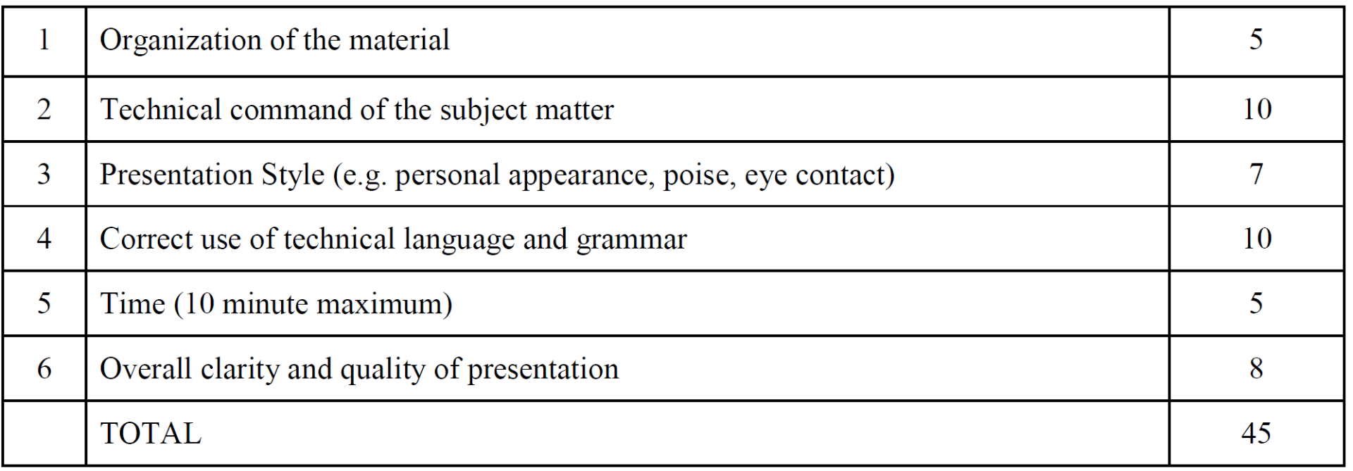 Judges will evaluate and score the presentations using the following maximum point values attributed to the specific criteria